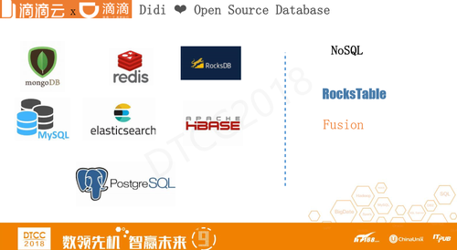 主流的开源数据库滴滴都有在使用,例如MongoDB、Redis、RocksDB、elasticsearch、HBase、PostgreSQL。除了标准的关系型数据库,在不同的场景下还有两个自研的NoSQL系统,一个是RocksTable,我们用来存储特征引擎,例如订单、司机等的特征引擎。