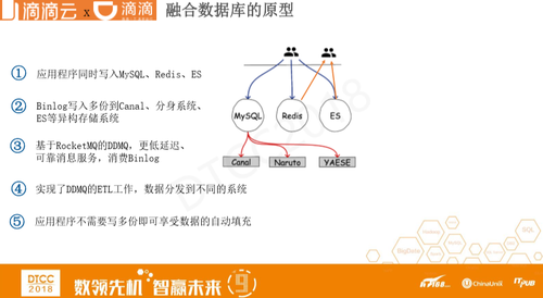 于是我们开始尝试融合数据库,最典型的就是业务代码会同时写入Redis、MySQL或者ES。绝大部分公司都是依次把数据写入各个数据库,写完之后MySQL中还有很多产品,例如我们虽然只有两个从库,但还有很多binlog应用程序,例如canal、Naruto、YAES等的。