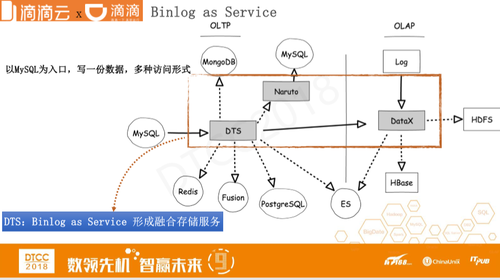 我们有个理念是Binlog as Service,涵盖支持了OLTP和OLAP两种场景。我们的目标是以MySQL为入口,写一份数据,多种访问形式。